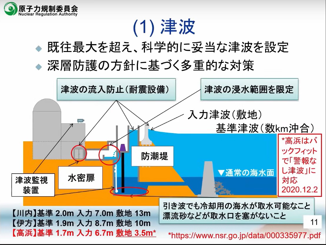 15:30 ![]() 【石渡】 ここから、自然ハザード関係の、今までやってきた規制の概要をご説明いたします。最初に、福島事故の1番の原因となった津波です。この津波対策というのが非常に重要です。津波については既往最大を超えて、科学的に妥当な津波を設定するとで、深層防護の方針に基づいて、多重的な対策を行うということが求められております。 例えば、ここに原子力発電所の原子炉があって、ここがこの色の濃いところが普段の水面で、ここにこういう高い津波が来た場合でも、大丈夫なように防潮堤を高くしてくださいと、この基準津波というのを決めるわけです。それがこう来た時でも、中に水が入らないだけの高い防潮堤を作ってください。 ただし、それを超えてしまう場合もあり得るので、そういった場合でも、この原子炉の建物の中に水が入んないように、水密扉を作ってくださいとか、当然のことながら、津波の監視装置を用意してくださいとか、そういう色々な条件がございます。 で、ここで1つ最初に申し上げておきたいのは、例えばこの高浜発電所、最近50年超の運転ということで話題になりましたが、この高浜発電所は、この原子炉が立っているところ、地盤の高さが3.5mなんです。 そうすると、津波が来た場合に、場合によっては浸水する可能性があるわけで、標高8mの高さの防潮堤が作られているんですけれれども、原子炉っていうのは、原子炉を冷却する水が必要なので、この取水口があるんで、この取水口というのはいつも空いてるわけです。そうすると、こっから津波が入ってくる可能性があるわけす。 それで、高浜の場合は最初の許可した時点では、気象庁が津波警報を出した時点で、この水門を閉めますという運用をしますということになっていたんですが、これが、実はその警報がいつも出るとは限らないでしょうという話になってきて、バックフィットかけるということになったわけです。これについて後でお話しします。 ※以下は編集者の注である。 当図は 「実用発電用原子炉に係る新規制基準の考え方について(別記) 耐震重要度分類に係る規制上の要求」 の100ページ目の図に近い。 |