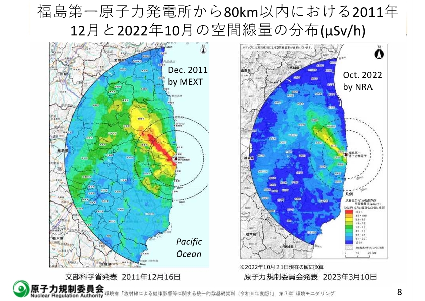 | [2024_11_18_23]福島第一原子力発電所から80km以内における2011年12月と2022年10月の空間線量の分布(μSV/h)(日本記者クラブ_石渡明(前原子力規制委員会委員)_会見2024年11月18日) |