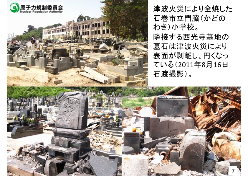 | [2024_11_18_24]津波火災により全焼した石巻市立門脇(かどのわき)小学校 隣接する西光寺墓地の墓石(日本記者クラブ_石渡明(前原子力規制委員会委員)_会見2024年11月18日) |