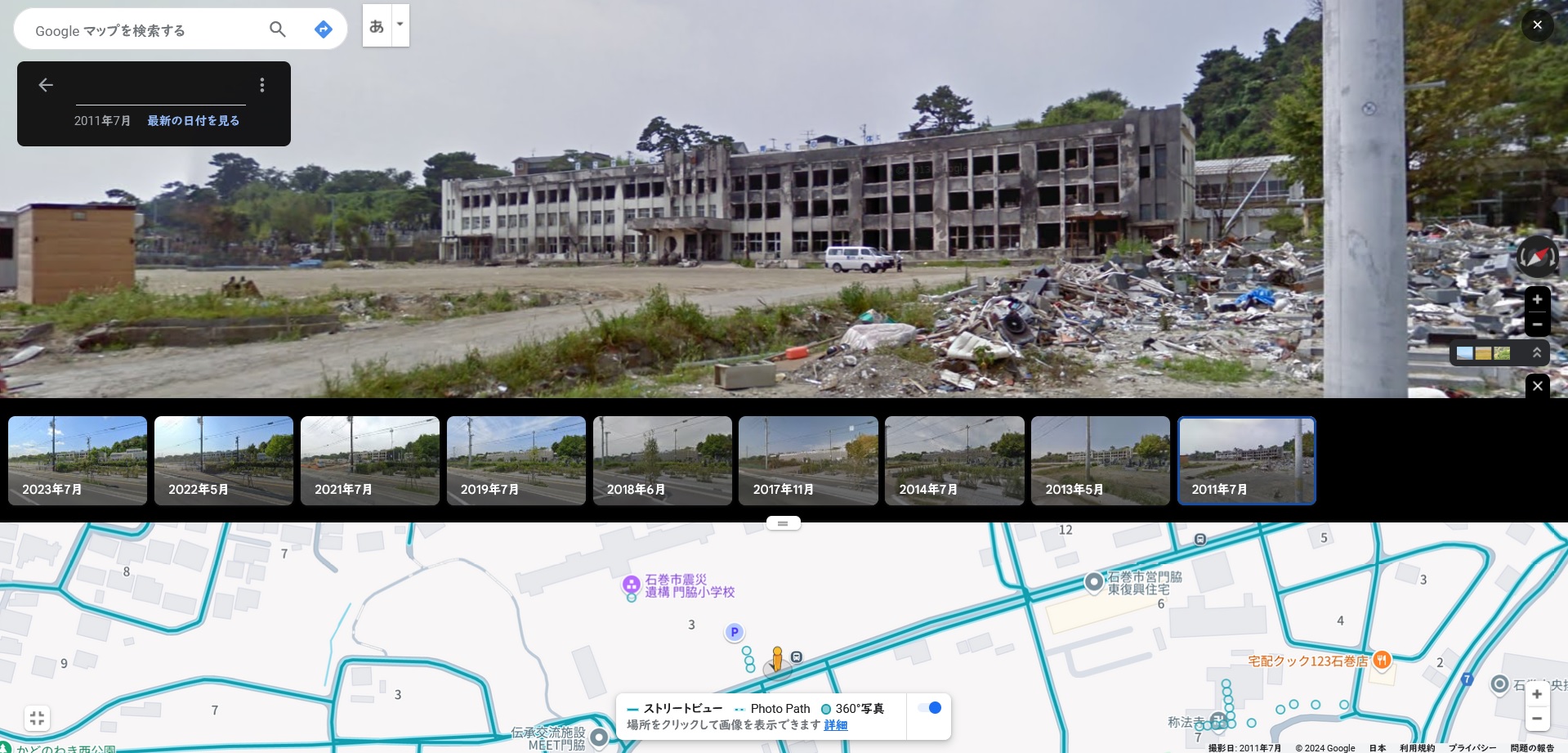 15:30 ![]() 【石渡】 これは宮城県の石巻市の門脇(かどのわき)小学校ですけれども、この小学校は周りが墓地になっておりまして、元々は全部墓地だったところをお寺さんが多分土地を提供して、小学校作ったんだろうと思うんですが、ここが津波っていうのは、ただ水が来るのではありません。 油とかあるいは木材が一緒に流れてきて、それらがこう燃えた状態で流れてくることがあります。津波火災ですね。ここへ来たその津波はそういった油とかこの材木、こういったものがたくさん、来まして、それらが燃えて火事になっているわけですね。 例えばここにお墓の墓石がございますけれども、これも表面の字が読めなくなっています。で周りが丸くこの四角い石が丸くなってしまってる。なぜこういうことになるかというと、非常に熱い火がこう来るわけですから、そこで急に暖められて、次の瞬間は冷たい水が来るわけで、それを何回も繰り返しますと、この表面から風化が非常に進んでボロボロになる。こういう立派な花崗岩の墓石が、もう周りからボロボロになって、まんまるになってしまうというのを私は初めて見ました。この小学校は津波火災の火をまともに受けて、全焼してしまったわけです。 ※以下は編集者の注である。 津波火災は2024年の能登半島地震でも発生していた。読売新聞の記事(2024/01/24)は コチラ 。 記事の内容の抜粋は以下の通り。 津波で流された自動車や家屋などががれきとなって浸水域の浅い場所に集積し、何らかの原因で出火したと推定。さらに流失しなかった家屋に燃え移って延焼した可能性があると分析した。焼失面積は1500平方メートルと算出され、市によると、火災による死者は出なかった。 津波火災は東日本大震災で被災した宮城県気仙沼市などでも確認された。津波で流れ出た家庭用プロパンガスのボンベや車から燃料が漏れて引火したとみられ、燃え広がった火が、住民が避難したビルに延焼したケースもあった。 江岸寺の2011年7月時点の ストリートビュー を以下に示す。小学校の校舎が黒ずんでいるのは火災のせいなのだろうか。 ![]() |