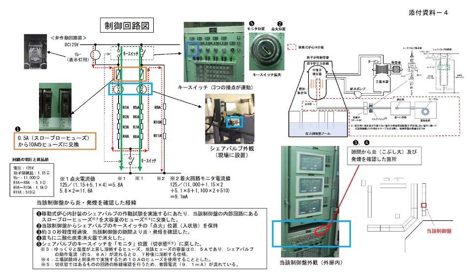 04:00 様式第18 事故・故障等発生報告書 東二総発第98号 令和7年2月12日 東海村長 山田修 殿 住所 茨城県那珂郡東海村大字白方1番の1 事業所名 日本原子力発電株式会社 東海事業本部東海第二発電所 氏 名 所長 山口嘉温 (公印省略) (中略) 別紙 2025年2月12日 日本原子力発電株式会社 東海第二発電所 中央制御室内制御盤における火災の発生について 1.状況 東海第二発電所は第25回定期事業者検査中のところ,2025年2月4日13時54分頃,東海第二発電所中央制御室内に設置されている移動式炉心内計装※1制御盤(以下,「当該制御盤」という)の隙間より炎(こぶし大)・発煙を確認したことから,二酸化炭素消火器による初期消火を実施すると共に,中央制御室より13時55分に公設消防へ通報(覚知時刻13時55分)した。また,自衛消防隊は14時07分に出動した。 公設消防は,14時09分に発電所に到着(消防車3台(サイレン・赤色灯有),指揮車1台(サイレン・赤色灯有))した。その後,14時28分に現場確認を実施した公設消防により鎮火※2が確認された。また,14時55分に本事象は火災と判断※3された。 ※1:原子炉運転中において,原子炉内の中性子を計測する検出器の校正等を行う設備。 ※2:炎・煙がないこと,再燃のおそれがないことを確認。 ※3:人の意に反した燃焼であること,消火設備を使用したことから判断。 [添付資料−1,2,3] 2.原因 現在,原因について公設消防と合同で調査を行っているが,現時点で判明した事実は以下のとおり。 (1)当該制御盤から炎・発煙を確認した経緯 聞き取りにより確認した結果は以下のとおり。 2025年2月4日,移動式炉心内計装のシェアバルブ※4の作動試験を実施するにあたり,当該制御盤の内部回路にあるスローブローヒューズ※5を大容量のヒューズ※6に交換した。その後,当社社員が中央制御室内に設置されている当該制御盤からシェアバルブのキースイッチの「点火」位置(入状態)を保持したところ,約30秒程度経過後,当該制御盤の隙間より炎・発煙を確認したため,直ちに二酸化炭素消火器で消火した。その後,シェアバルブのキースイッチを「モニタ」位置(切状態※7)に戻した。 ※4:原子炉建屋2階に設置されており,緊急時に検出器が引抜けない場合や格納容器隔離弁が全閉しない場合に限って当該制御盤より作動させケーブルを切断し,格納容器の隔離を行う弁。 ※5:通電によりゆっくりと温度が上昇し溶断するヒューズ。当該ヒューズの容量は0.5Aであり,シェアバルブの動作電流(約5.8A)が流れると0.7秒後に溶断する仕様。 ※6:工場出荷時の試験と同条件で実施するため10Aのヒューズを使用することとした。 ※7:切状態ではあるものの回路の断線確認を行うため,微弱電流(9.1mA)が流れている。 [添付資料−4] (2)当該制御盤の点検結果 当該制御盤内について目視点検を行った結果は以下のとおり。 当該制御盤内は,操作スイッチ,ヒューズ,抵抗器,リレー,端子台,表示灯等で構成されている。これらについて,目視点検をしたところ,当該制御盤内天板部及び端子台(ポリカーボネート製)にすすの付着や変色を確認しており,特に抵抗器に近接する端子台の一部には焼損があることを確認した。なお,その他の構成機器には変色等の異常がないことを確認した。 [添付資料−5] (3)当該制御盤等の過去の更新・点検状況 1)当該制御盤 当該制御盤は第25回定期事業検査中の2011年に設置(設備更新)していることを確認した。その後,現在まで発電所は停止中であり,当該設備は使用していない。なお,2023年11月14日に盤内機器に変色・塵埃の付着等の有無について点検を行っており異常がないことを確認している。 2)シェアバルブ シェアバルブは2009年に交換していることを確認した。その後,2011年以降現在まで発電所は停止中であり,当該設備は使用していないため,点検は実施していない。 (4)端子台の一部が焼損に至った原因調査 (1)〜(3)の調査の結果,端子台の一部が焼損に至った要因について抽出を行った。 1)経年劣化 当該制御盤内部回路を長期間通電状態とすることにより内部回路部品が経年劣化すると,絶縁性能の低下等により火災に至る可能性がある。このため当該制御盤の使用状況を確認したところ,第25回定期事業者検査中の2011年に設置(設備更新)し,その後,現在まで発電所は停止中のため,当該設備は使用しておらず,回路断線確認の観点から微弱電流(9.1mA)を通電しているのみであることから経年劣化が要因となる可能性は考え難い。 2)製造不良 当該制御盤の製造不良(初期不良)がある場合,使用時に異常をきたし火災に至る可能性がある。このため当該制御盤の製造時の試験記録を確認したところ,製造時の試験結果に問題が確認されなかったことから,製造不良が要因となる可能性は考え難い。 3)接触不良 焼損していた端子台の端子部に接触不良がある場合,火災に至る可能性がある。このため端子部の確認をしたところ,端子部はハンダ付けで接続されており,ハンダ不良による接触不良があった際には局所的な焼損となることが考えられるが,焼損していた端子台に接