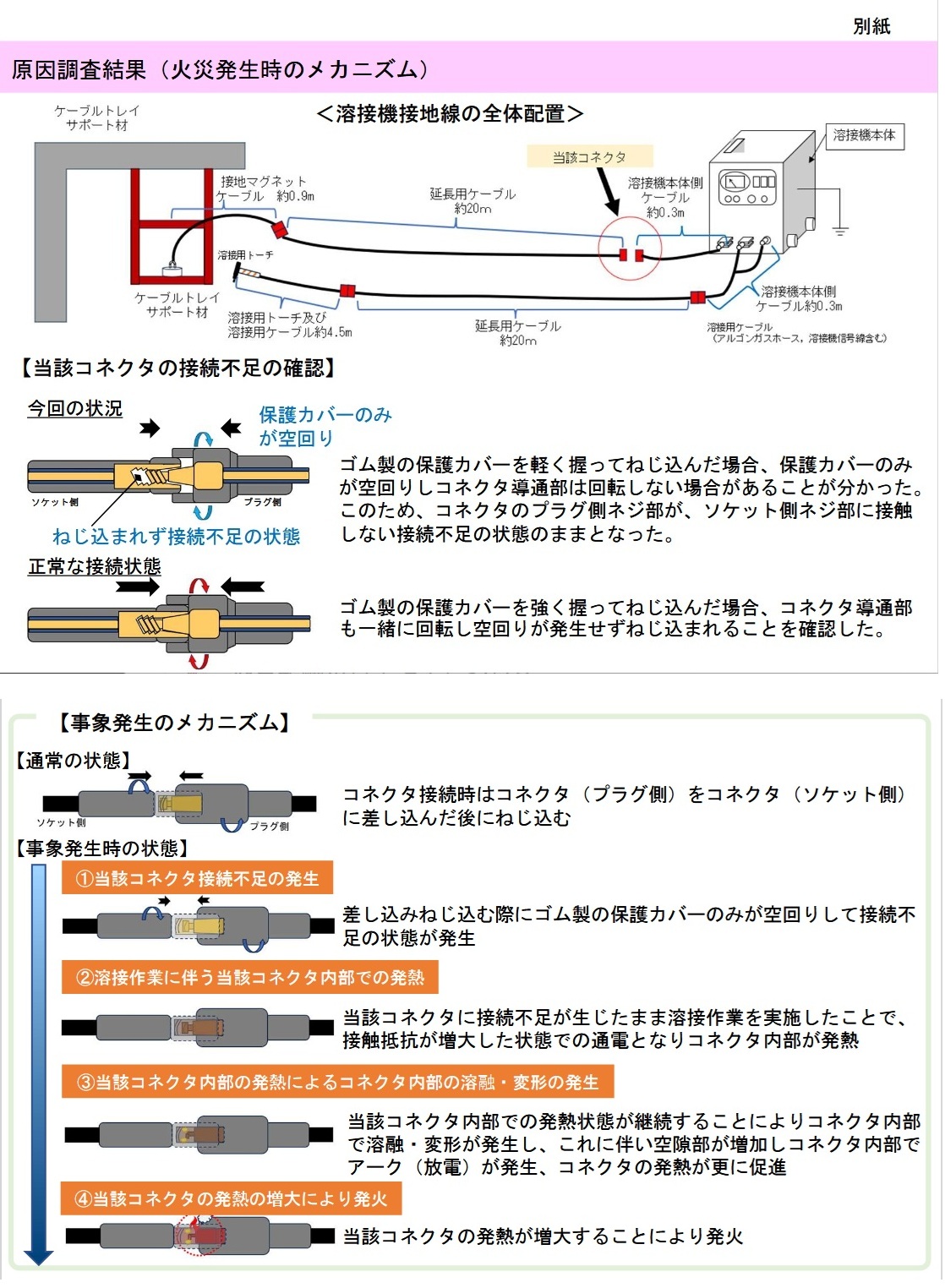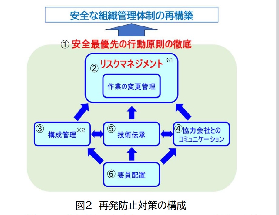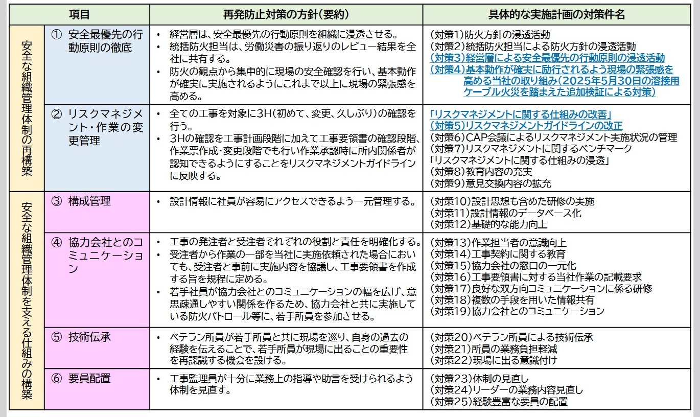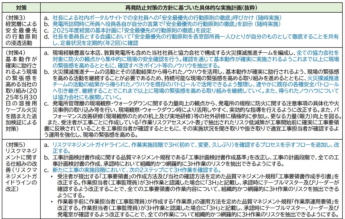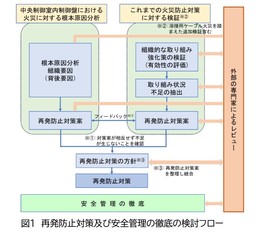 04:00 2025年8月8日 日本原子力発電株式会社 東海第二発電所 中央制御室火災を踏まえた再発防止対策及び安全管理の徹底について(最終報告) 当社は、東海第二発電所において火災が続いたことを受け、火災の発生防止のための組織的な取り組み強化を行い、再発防止に取り組んできました。 この取り組みを進めている中、本年2月に東海第二発電所の中央制御室において火災を発生させたことを踏まえ、茨城県より「火災対策の徹底について(厳重注意)」、東海村より「安全管理の徹底について(要請)」の文書を受領しました。 (2025年2月14日お知らせ済み) 当社は、茨城県及び東海村に、根本原因分析及びこれまでの火災防止対策に対する検証の2つの評価プロセスをもとに再発防止対策及び安全管理の徹底について検討を進め、3月28日に初回報告を行いました。その後、組織要因を含む根本原因分析及びこれまでの再発防止対策について不足していた点がなかったか、火災防止の観点のみならず作業における安全管理の確保についても不足がなかったか等の深掘りを含めた検証を行い、その内容を再発防止対策の方針として取り纏め、6月13日に「中間とりまとめ」としてご報告しました。 (2025年3月28日、6月13日お知らせ済み) 当社は、本日、中間とりまとめにおける再発防止対策の方針に基づき、具体的な実施計画を含めた再発防止対策及び安全管理の徹底について茨城県及び東海村に最終報告を行いました。なお、取り纏めにあたっては、5月30日に発生した原子炉建屋地下1階 溶接用ケーブル(接地線)からの火災についても追加検証を行い、再発防止対策を立案しています。 また、中央制御室内制御盤における火災及び原子炉建屋地下1階 溶接用ケーブル(接地線)からの火災について、安全協定等に基づく事故・故障等発生報告書(最終報告)を関係自治体に提出しました。 今後、組織力の向上と安全文化の改善により安全管理を徹底するとともに、対応状況や安全に対する当社全般の取り組みを積極的に公開することで、地域の皆さまの信頼の回復に努めてまいります。 添付資料 1. 東海第二発電所 中央制御室火災を踏まえた再発防止対策及び安全管理の徹底について (最終報告) 2. 東海第二発電所 中央制御室内制御盤における火災の発生について(最終報告) 3. 東海第二発電所 原子炉建屋地下1階 溶接用ケーブル(接地線)からの火災の発生について(最終報告) 以 上 ◆参考資料 東海第二発電所 中央制御室火災を踏まえた再発防止対策及び安全管理の徹底について(最終報告) ---------------------------------------------------------------------------------------------- 添付資料1 東海第二発電所 中央制御室火災を踏まえた再発防止対策及び安全管理の徹底について(最終報告) 2025年8月8日 日本原子力発電株式会社 ---------------------------------------------------------------------------------------------- 再発防止対策の検討方針及び構成 1. 中央制御室内制御盤における火災に対する根本原因分析及びこれまでの火災防止対策に対する検証の二つの評価プロセスを基に、外部の専門家によるレビューも受け、再発防止対策の方針を取り纏めました。(図1) (2025年6月13日に「中間とりまとめ」として報告) 2. 2025年5月30日に発生した原子炉建屋地下1階 溶接用ケーブル(接地線)からの火災についても追加検証を行い、再発防止対策に反映しました。 3. 「安全な組織管理体制の再構築」に向けた再発防止対策の構成は、 「安全な組織管理体制の再構築」の根幹となる安全最優先の行動原則の徹底(@)及びリスクマネジメント・作業の変更管理(A)と、これを支える「安全な組織管理体制を支える仕組みの構築」(BCDE)からなり、これにより、火災発生防止はもとより発電所の安全運営に寄与する自主的・継続的な改善を行ってまいります。(図2) ![]() ![]() ---------------------------------------------------------------------------------------------- 再発防止対策(再発防止対策の方針及び具体的な実施計画) 再発防止対策は実施していく中で、その実効性を評価し、実施計画の統合・拡充を含めた見直しを行い、継続的に改善を図ります。(青字は早期に取り組む重要な対策) ![]() ---------------------------------------------------------------------------------------------- 早期に取り組む再発防止対策(具体的な実施計画) 以下に示す実施計画は、安全最優先の行動原則の徹底において重要な事項として早期に取り組んでいます。 ![]() ---------------------------------------------------------------------------------------------- 組織力の向上と安全文化の改善による安全管理の徹底 1. 外部専門家や地域の方々からの助力を得て再発防止対策を策定しました。 2. 持続的な安全管理体制の維持及び向上のため、再発防止対策を継続することはもとより、今回の検討の中で 得られた以下の心構えを社員全員の組織文化とすることが重要と認識しています。 3. これらを継続的に実施・評価・改善することで、当社の組織力の向上、更には安全文化の改善を図り、安全管理の徹底を浸透させてまい