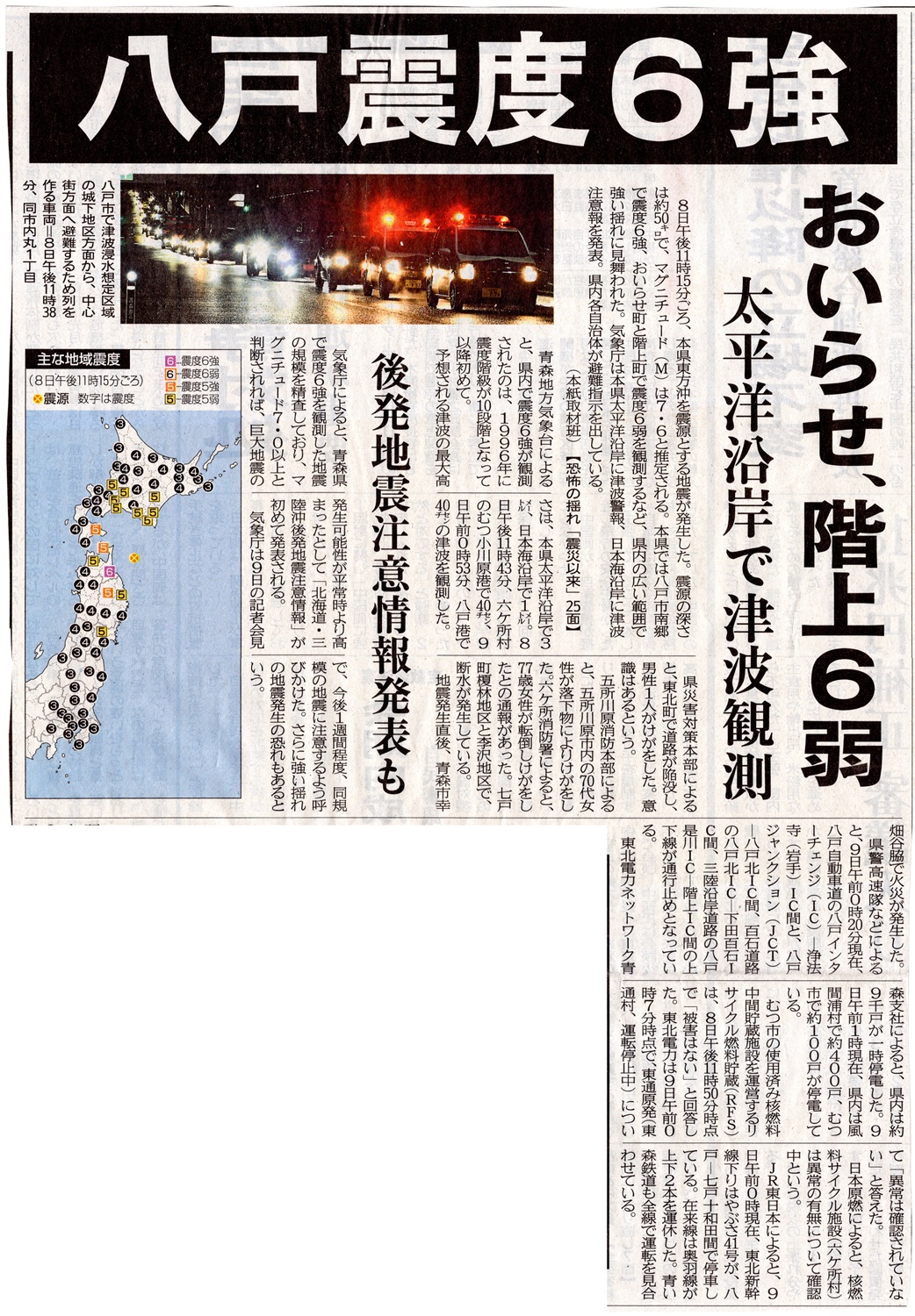 [2025_12_09_44]八戸震度6強 おいらせ、階上6弱 太平洋沿岸で津波観測 後発地震注意情報発表も(東奥日報2025年12月9日)