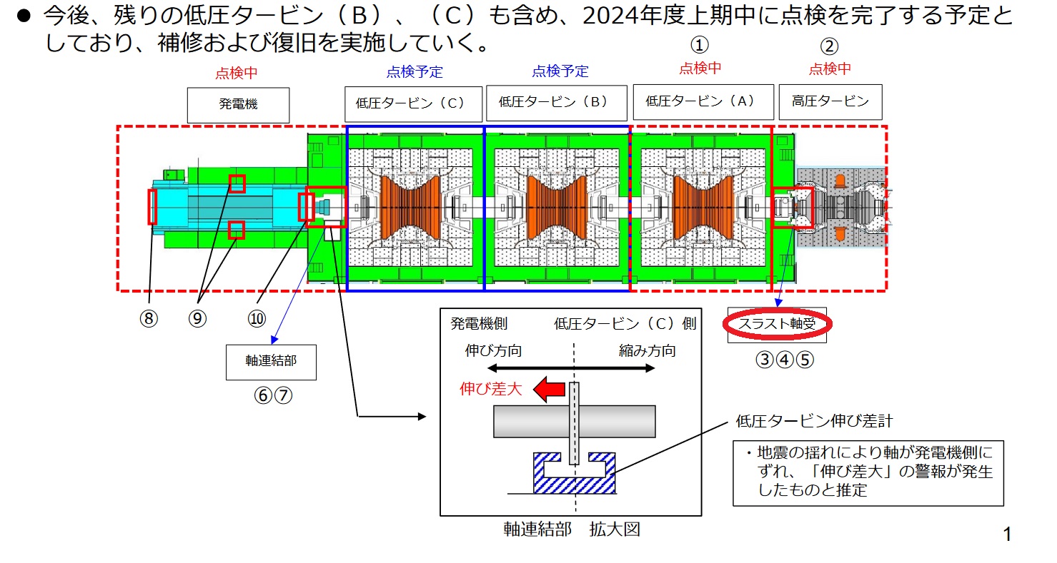 また、2号機低圧タービンにおいて「伸び差大」警報が発生したことから、タービン・発電機の詳細点検を実施しております(3月25日にお知らせ済)。これまでの点検の結果、発電機およびスラスト軸受等に損傷が見られたものの、タービンの動翼・静翼等の主要な部位には現時点で大きな損傷は確認されませんでした。引き続き点検を進め、必要な補修を行ってまいります。(添付資料2)