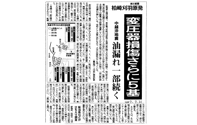 | 柏崎刈羽原発 変圧器損傷さらに5基 油漏れ一部続く 立ち入り調査 | 朝日新聞 | 2007/07/21 |