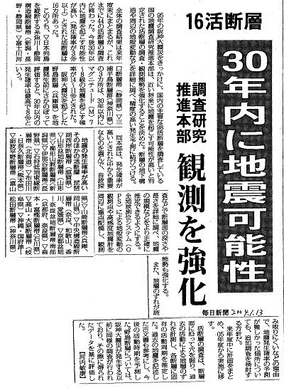 | 16活断層 30年以内に地震可能性 調査研究推進本部 観測を強化 | 毎日新聞 | 2004/01/13 |