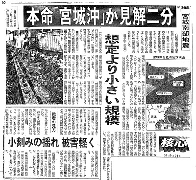 | 宮城南部地震 本命「宮城沖」か見解二分 想定より小さい規模 小刻みの揺れ 被害軽く 揺れ14秒前に速報 | 中日新聞 | 2005/08/17 |