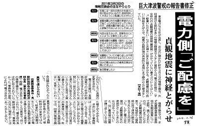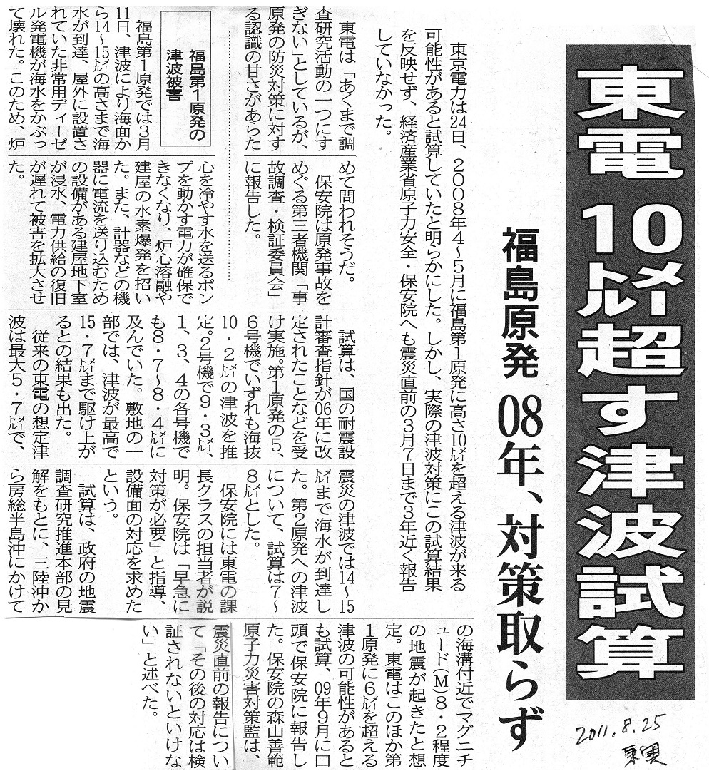 政府の地震調査研究推進本部は2002年7月、福島県沖を含む日本海溝で「マグニチュード(M)8級の津波地震が起きる可能性がある」と指摘した。東電はこの「長期評価」をもとに08年、福島第1原発に到来が想定される津波を最大15・7メートルと試算。だが、この試算に合わせた対策が取られることはなく、東電は電力会社の研究者や大学教授らでつくる「土木学会」が策定した津波の計算式「津波評価技術」を根拠に、想定津波を6・1メートルと「過小評価」した対策を実施。東日本大震災当日を迎えた。(中略) 2002年 2月 土木学会が原発への想定津波を計算する「津波評価技術」策定(東電はこの後、想定津波を5.7メートルに) 7月 政府の地震調査研究推進本部が「長期評価」公表。福島沖でもM8級の津波地震が起こりうると指摘 ー> 数カ月後には東電は大津波を予見できた(後略) |