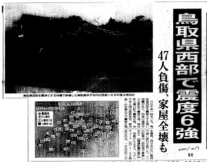 | 鳥取県西部で震度6強 47人負傷、家屋全壊も M6以上の余震の恐れ | 東奥日報 | 2000/10/07 |