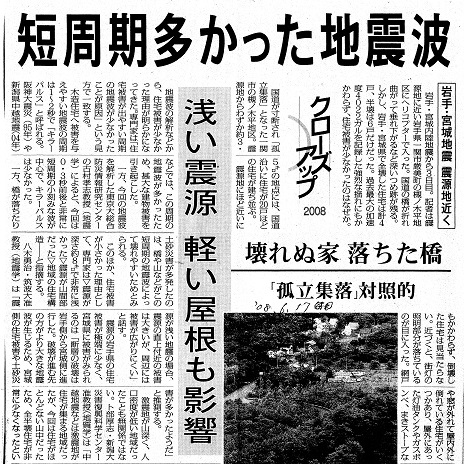 | 岩手・宮城地震 震源地近く 短周期多かった地震波 浅い震源 | 毎日新聞 | 2008/06/17 |