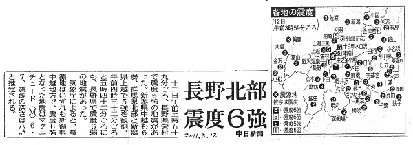 | 長野北部震度6強 | 中日新聞 | 2011/03/12 |