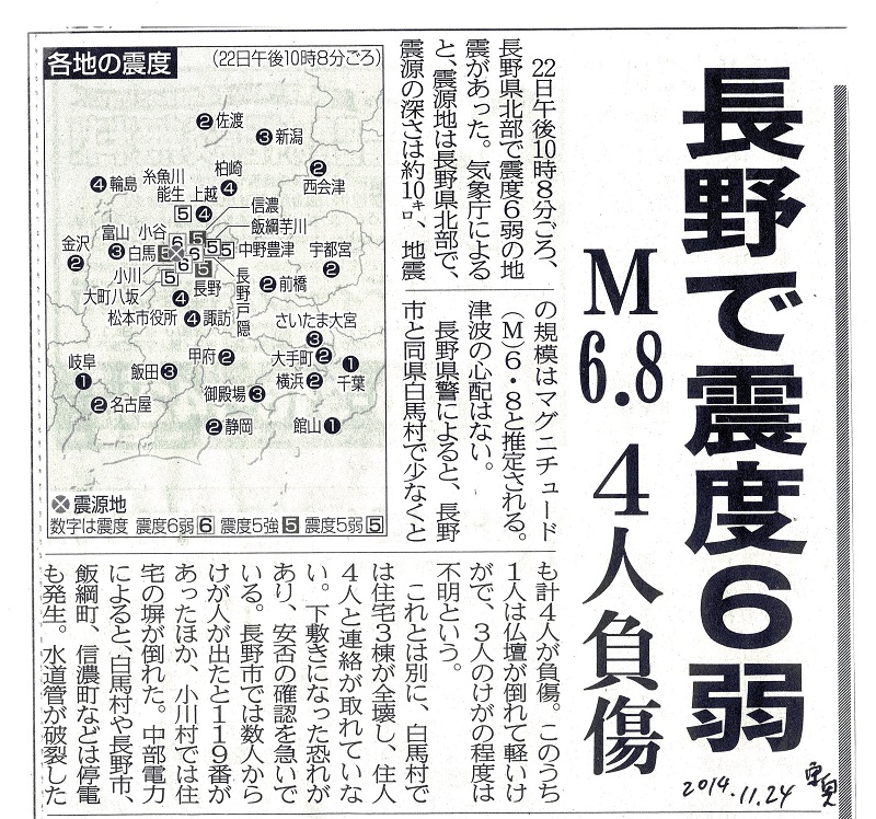 | 長野で震度6弱 M6.8 4人負傷 | 東奥日報 | 2014/11/24 |