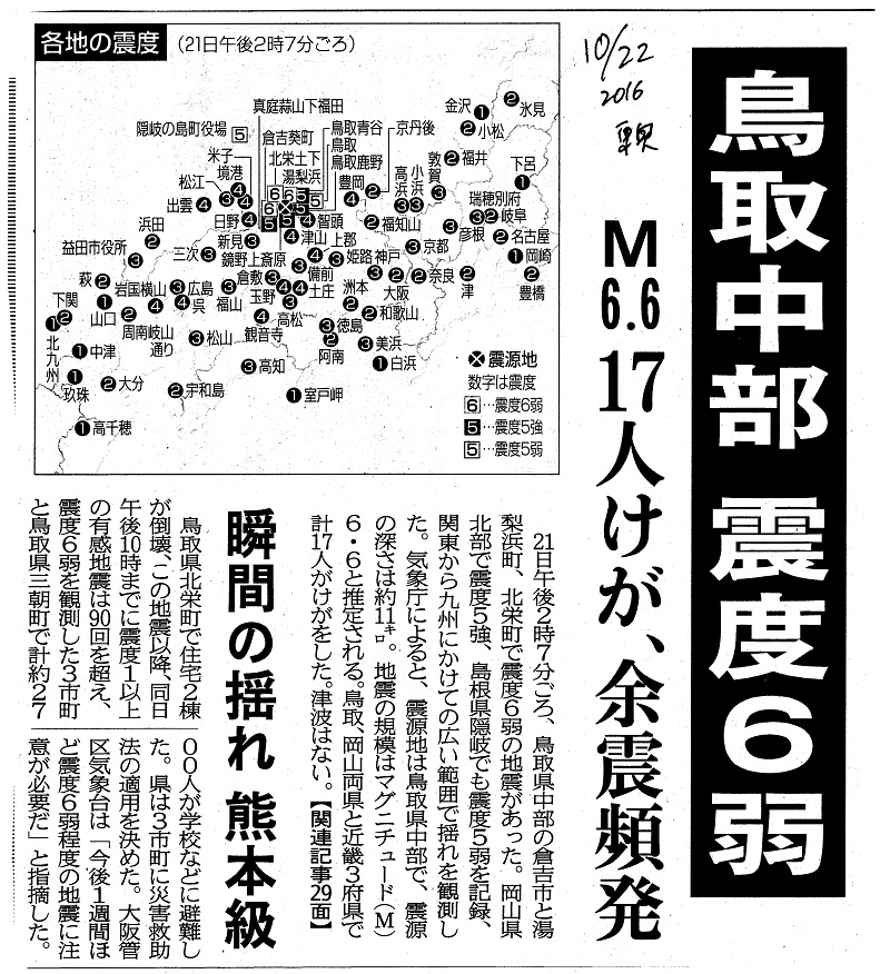 | 鳥取中部 震度6弱 M6.6 17人けが、余震頻発 瞬間の揺れ 熊本級 | 東奥日報 | 2016/10/22 |