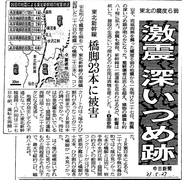 | 東北の震度6弱 激震 深いつめ跡 東北新幹線 橋脚23本に被害 | 中日新聞 | 2003/05/27 |