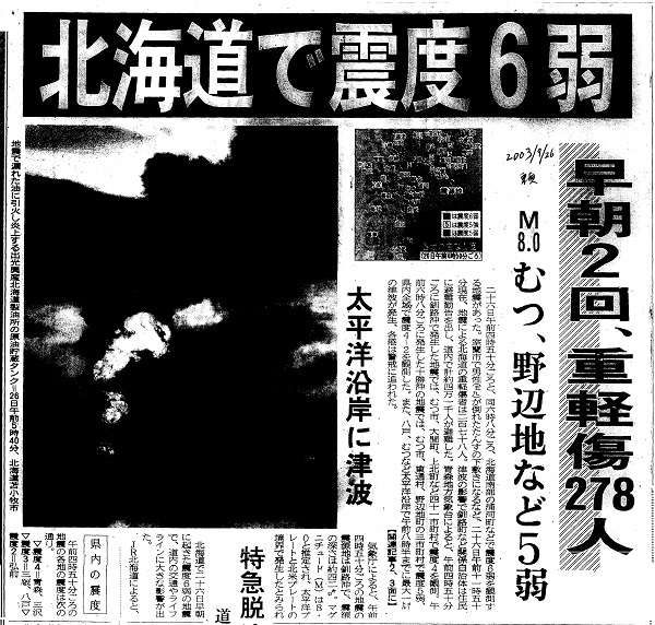 | 北海道で震度6弱 早朝2回、重軽傷278人 M8.0 太平洋沿岸に津波 | 東奥日報 | 2003/09/26 |