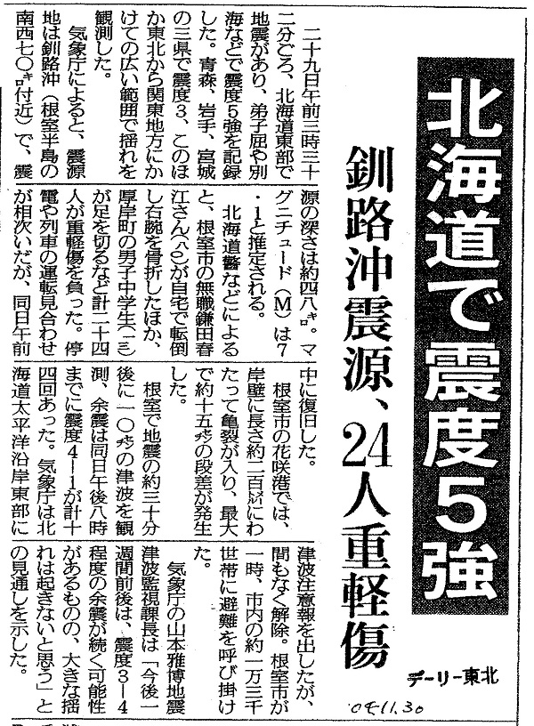 | 北海道で震度5強 釧路沖震源、24人重軽傷 | デリ東北 | 2004/11/30 |