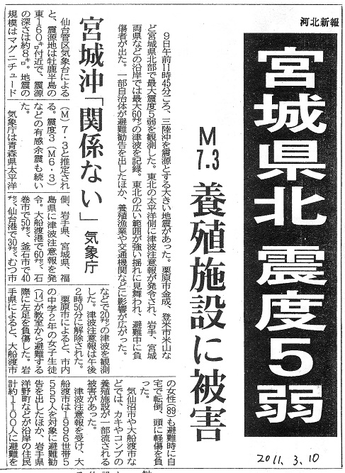| 宮城県北 震度5弱 M7.3 養殖施設に被害 宮城沖「関係ない」気象庁 | 河北新報 | 2011/03/10 |