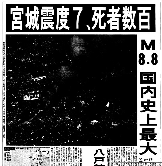 | 宮城震度7、死者数百 M8.8 国内史上最大 | 東奥日報 | 2011/03/12 |