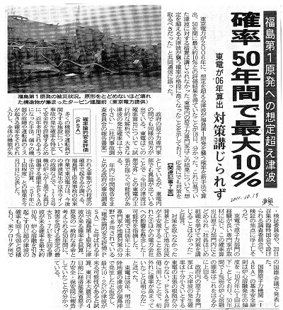 | 福島第1原発への想定超え津波 確率50年間で最大10% 東電が06年算出 | 東奥日報 | 2011/10/19 |