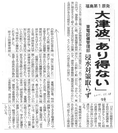 | 福島第一原発 大津波「あり得ない」 東電設備管理部 浸水対策取らず | 東奥日報 | 2011/11/28 |