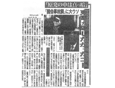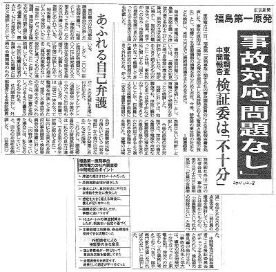 | 福島第一原発 事故対応「問題なし」 東電調査中間報告 | 東京新聞 | 2011/12/03 |