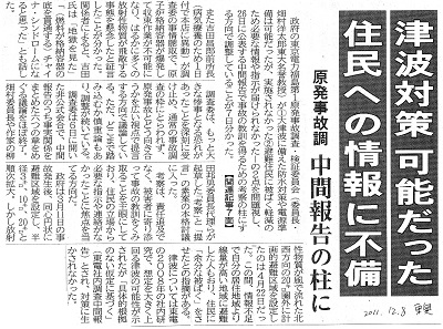 | 津波対策可能だった 住民への情報に不備 原発事故調 中間報告の柱に | 東奥日報 | 2011/12/08 |
