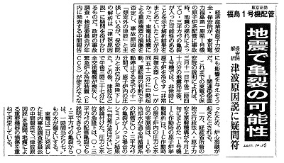 | 保安院解析1号機配管地震で亀裂の可能性 | 東京新聞 | 2011/12/15 |