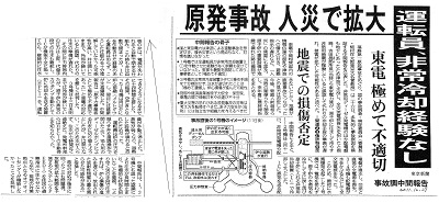 | 原発事故人災で拡大 運転員、非常冷却経験なし 東電 極めて不適切 | 東京新聞 | 2011/12/27 |
