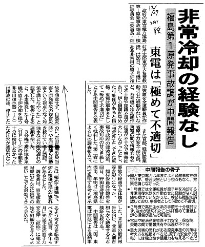 | 非常冷却の経験なし 福島第1原発事故調が中間報告 東電は「極めて不適切」 中間報告の骨子 | 東奥日報 | 2011/12/27 |