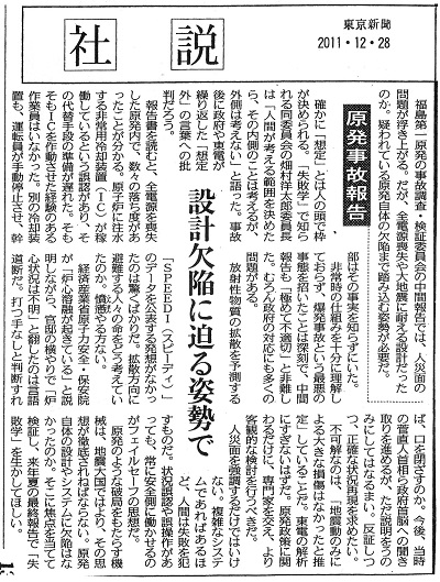 | 社説 原発事故報告 設計欠陥に迫る姿勢で | 東京新聞 | 2011/12/28 |