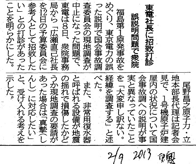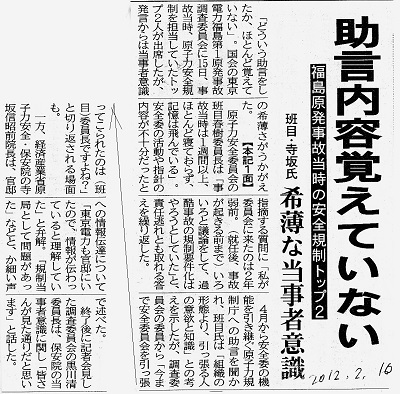 | 助言内容覚えていない 福島事故当時の安全規制トップ2 斑目・寺坂氏 | 東奥日報 | 2012/02/16 |