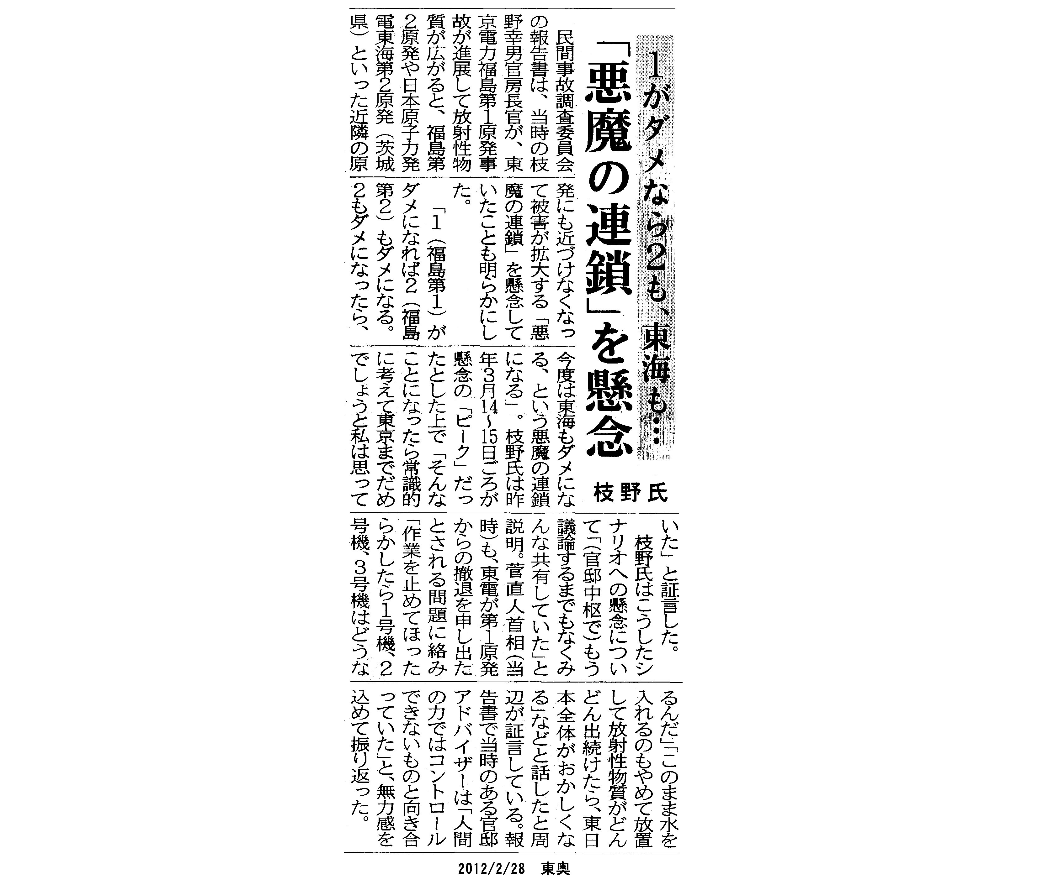 | 1がダメなら2も、東海も・・・ 「悪魔の連鎖」を懸念 枝野氏 | 東奥日報 | 2012/02/28 |