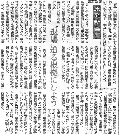 ○川内・高浜・伊方・大飯・玄海の稼働は危険2013年7月に施行した「新規制基準」は、福島第一原発事故の検証をしないまま、既存の原発の稼働を早める為に約8か月で策定された不合理な基準であり、「世界最高水準」は大嘘だ。(後略)