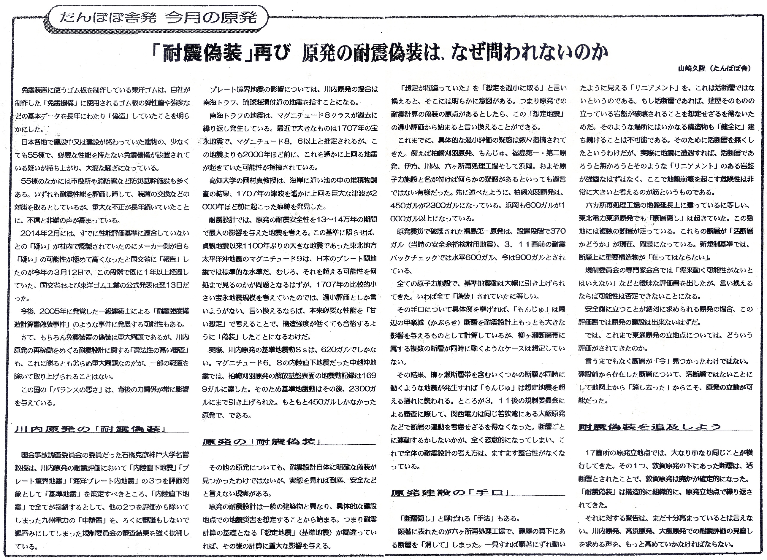 | 福島第一原発事故原因を誤魔化し 「文芸春秋9月号」と「岩波科学8月号」が明らかにする地震原因 | たんぽぽ | 2019/08/21 |