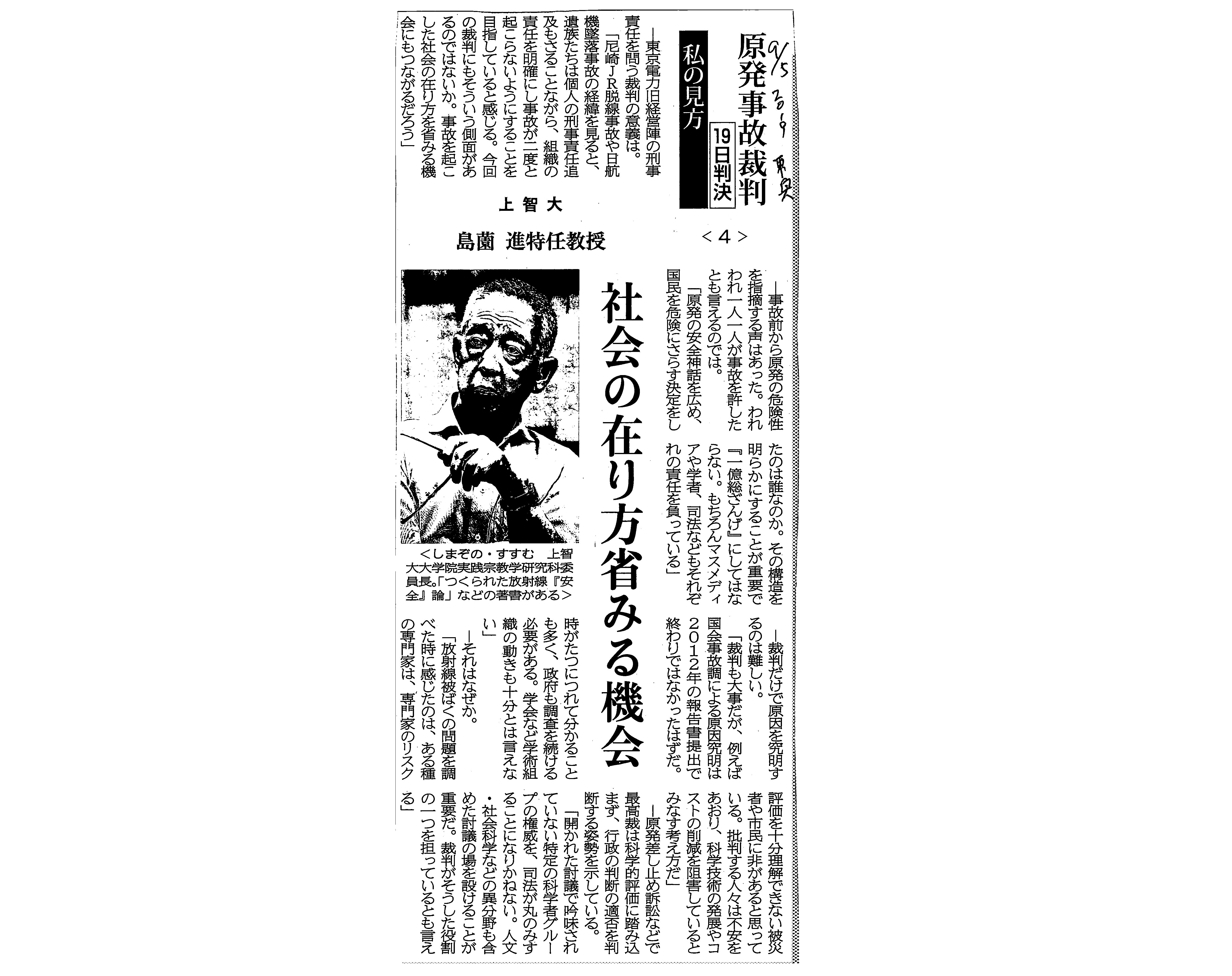 | 原発事故裁判 19日判決 私の見方 <4> 上智大 島薗進 特任教授 社会の在り方省みる機会 | 東奥日報 | 2019/09/05 |