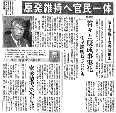 北海道電力が7日に泊原発1号機の再稼働のため、経済産業省原子力安全・保安院に安全評価(ストレステスト)の1次評価報告書を提出した。(中略) ストレステストに法的裏付けはないが、原発推進を掲げる電力業界も協力を惜しまない。電気事業連合会の八木誠会長(関電社長)は「早期の再稼働に結びつくよう、努力していきたい」と繰り返している。(後略)