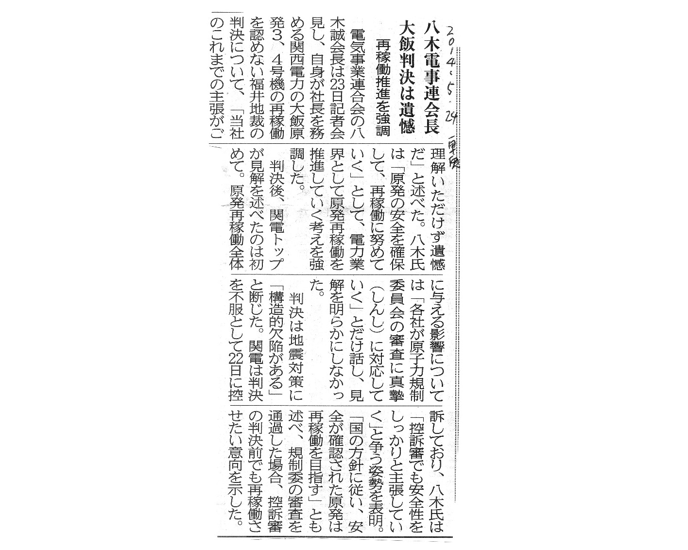 | 八木電事連会長 大飯判決は遺憾 再稼働推進を強調 | 東奥日報 | 2014/05/24 |