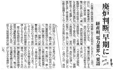 | 廃炉判断「早期に」 経産相、電力業界へ要請 | 東奥日報 | 2014/10/18 |