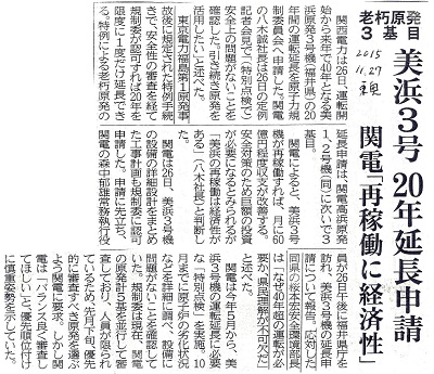 | 老朽原発3基目 美浜3号 20年延長申請 関電「再稼働に経済性」 | 東奥日報 | 2015/11/27 |