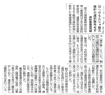 | 国へのもんじゅ勧告 廃炉の選択除外せず 規制委員長見解 | 東奥日報 | 2015/12/03 |