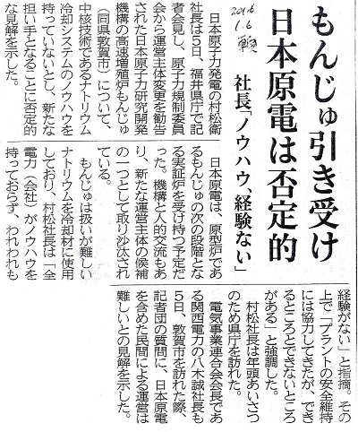 | もんじゅ引き受け 日本原電は否定的 社長「ノウハウ、経験ない」 | 東奥日報 | 2016/01/06 |