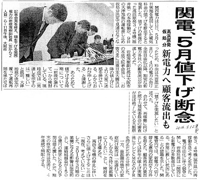 | 関電、5月値下げ断念 高浜原発仮処分 新電力へ顧客流出も | 東奥日報 | 2016/03/12 |