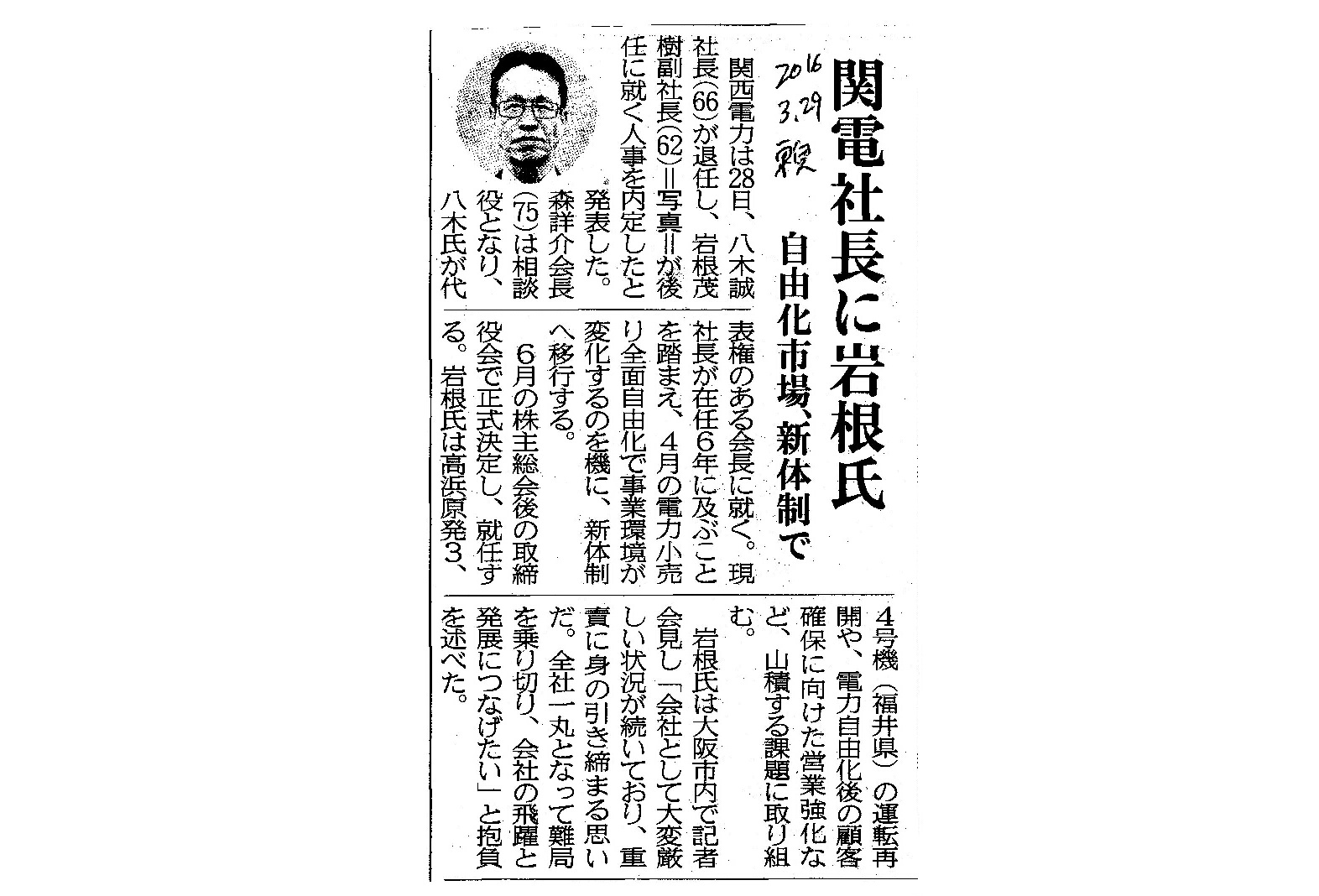 | 電事連会長に関西電力の岩根氏 6月、自由化や原発対応 | 共同通信 | 2019/03/21 |