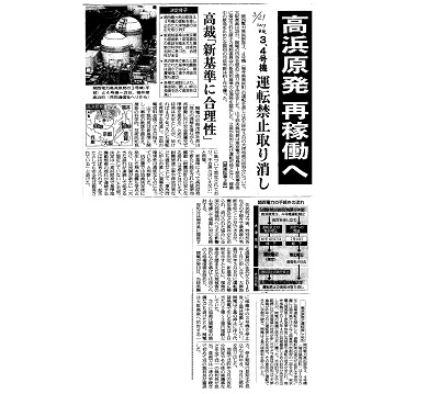| 高浜再稼働認める 3、4号機の仮処分取り消し 司法判断1年で覆る | 東京新聞 | 2017/03/29 |