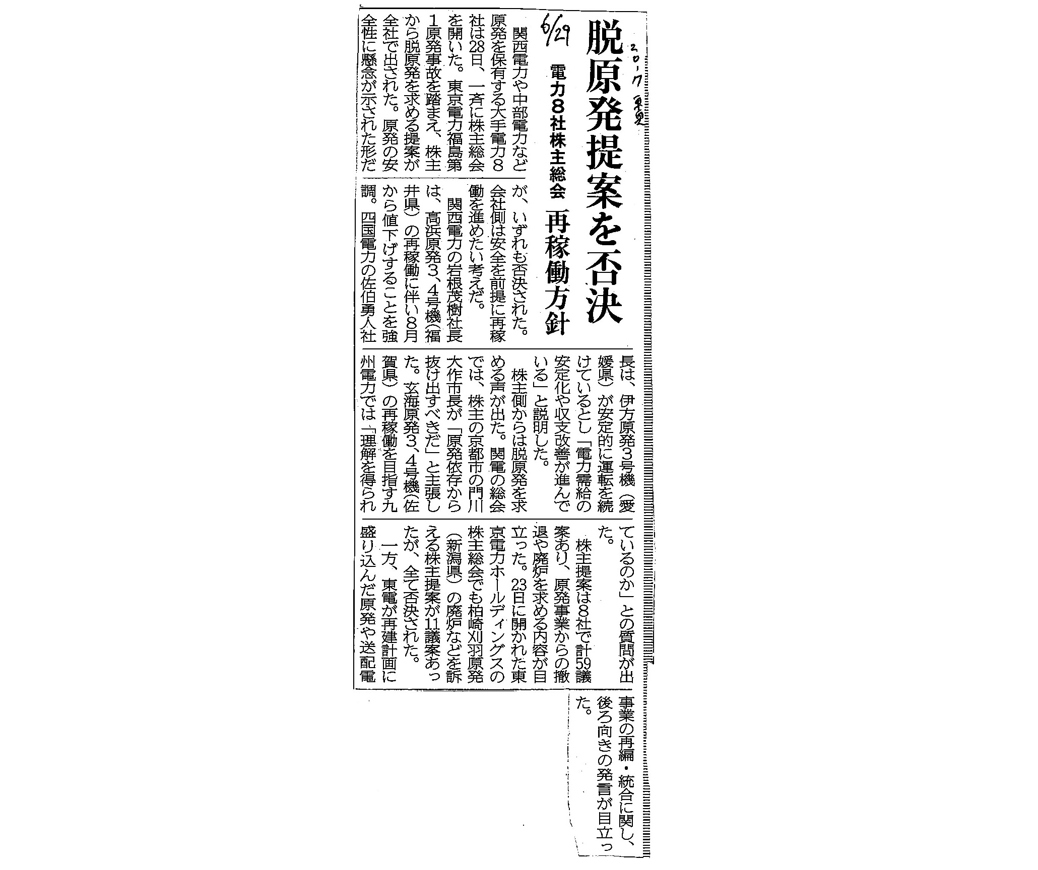 | 脱原発提案を否決 電力8社株主総会 再稼働方針 | 東奥日報 | 2017/06/29 |