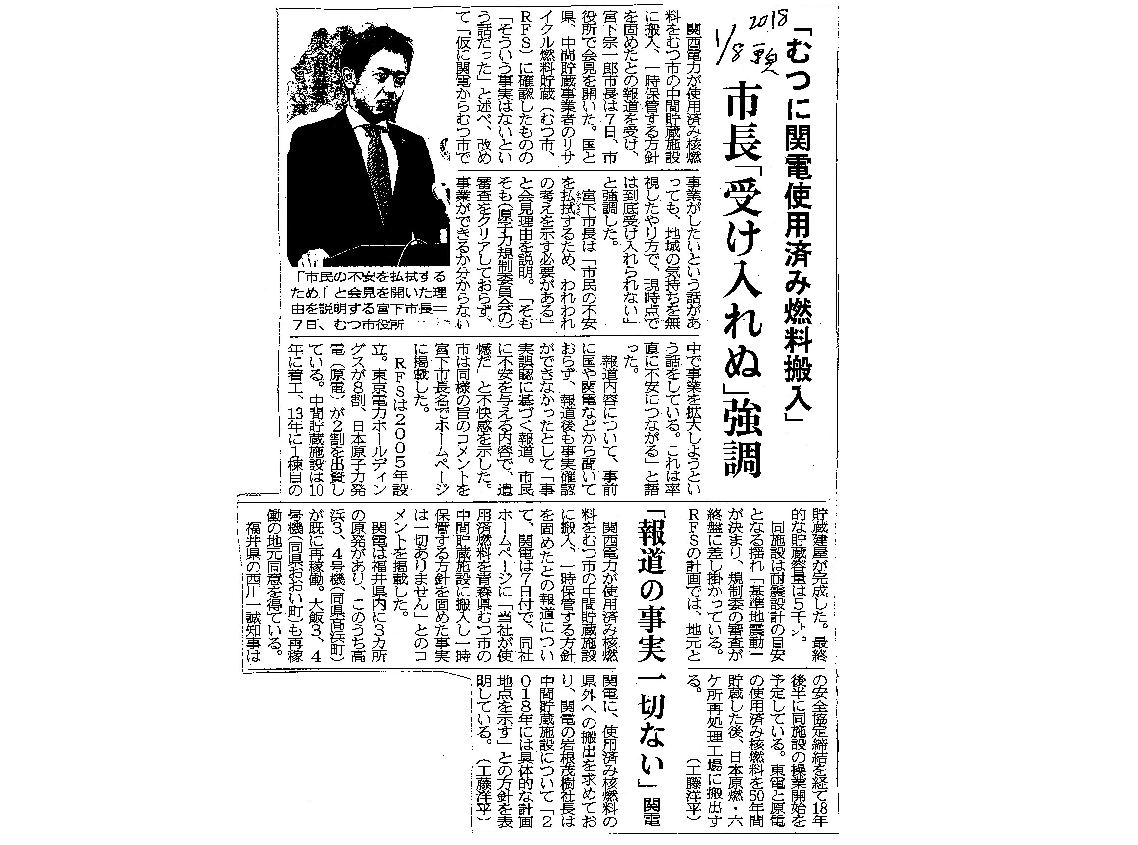 | 使用済み燃料搬入 市長「受け入れぬ」強調 「報道の事実一切ない」関電 | 東奥日報 | 2018/01/08 |
