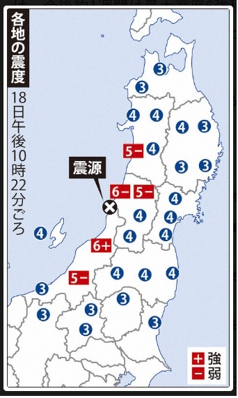 18日午後10時22分ごろ、山形県沖を震源とする地震があり、新潟県村上市で震度6強の揺れを観測した。気象庁は山形県、新潟県上中下越と佐渡、石川県能登に津波注意報を出した。
