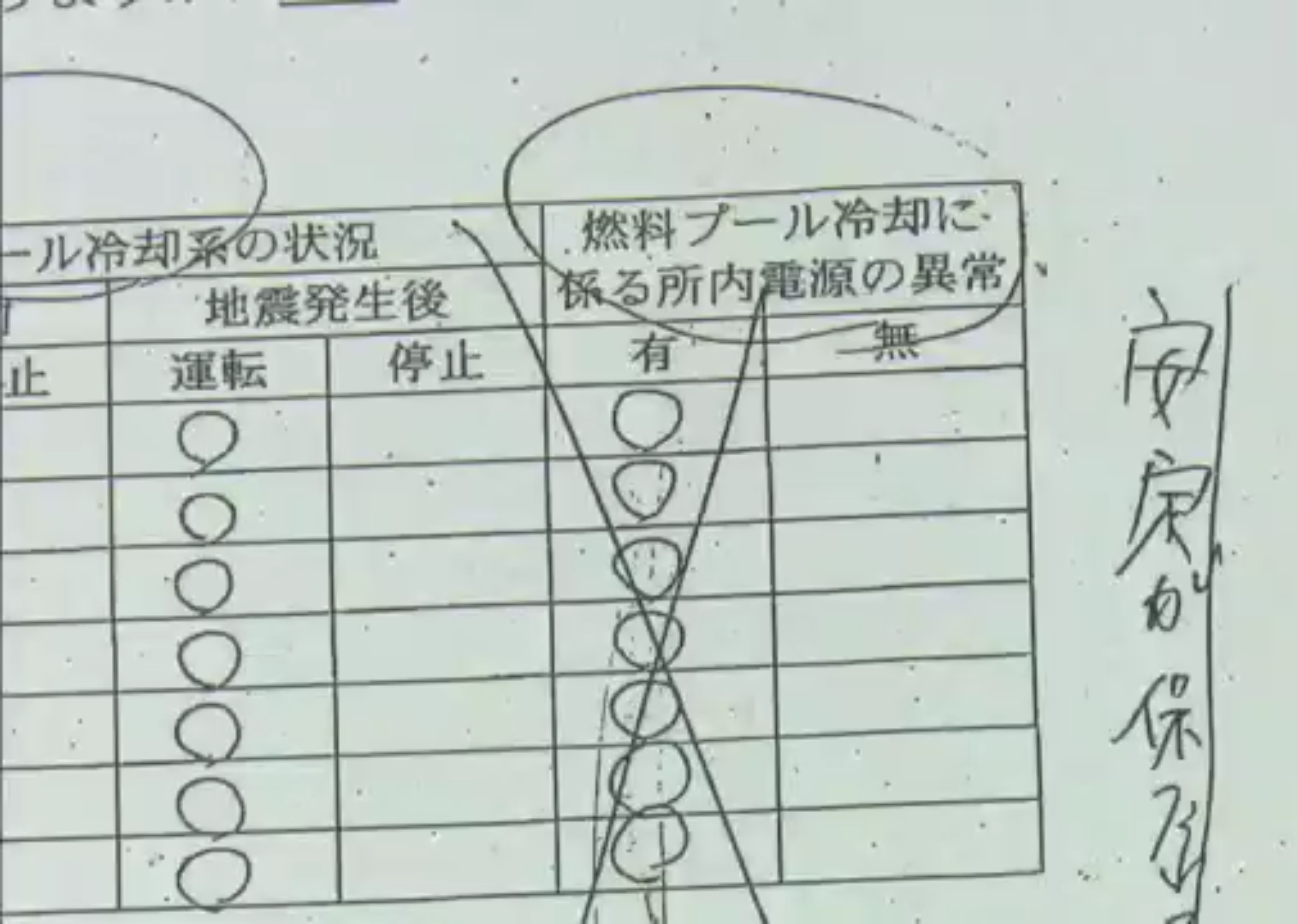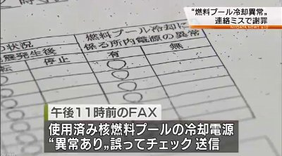 誤りがあったのは、東電が立地自治体の同市や刈羽村、新潟県などに対し、18日午後10時52分に送ったファクス。使用済み燃料プールを冷却する電源の状況を伝える項目に、全7基とも「異常あり」を示す「有」の欄に「○」がついていた。同原発は全7基が停止しており、現状では燃料プールの事故リスクが最も高い。(後略) |