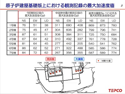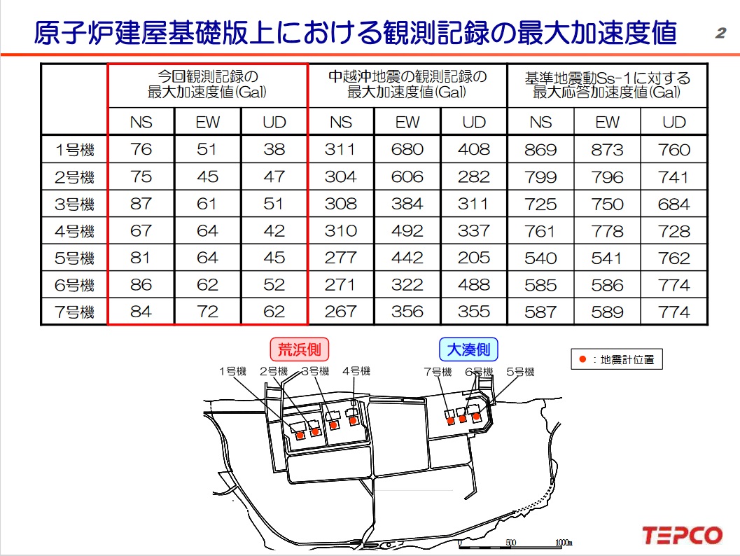 地震動についてこれまでは、 最大値が87.1ガル と各号機のデータは公表されたが建屋の他の階や地盤系の地震データは公表されてはいない。 また、東電は、地震のデータを原子力規制庁(規制庁)に提供し、原子力規制庁のHPにて当該資料が公開されたため、これにあわせて能登半島地震における全号機の原子炉建屋基礎盤の加速度値を公開したと説明している。東電が進んで公表したわけではない。 なお、東電は「原子炉建屋基礎盤以外の観測値については、建屋応答の影響等を分析の上、その内容を踏まえて、必要に応じて情報を公開したいと考えております。」と回答している。 地震の採れで記録された最大値は3号機の87.1ガルで、柏崎刈羽原発で想定する基準地震動による地震動と比べて下回っていた。 しかし柏崎刈羽原発にとって「小さく遠い地震」の揺れで、なぜかスクラム信号が発信される規模の大きさを観測したと報じられている。 即ち、原発を停止させるために設置された地震計では120ガルを超える揺れを観測していたことになる。(原子炉自動停止の「地震加速度大」設定値は原子炉建屋の最地下階床で水平120ガル、上下100ガル、原子炉建屋の中間階床で水平185ガル。) もちろん、地盤と建家内では揺れの大きさが異なることは普通で、建屋内に設置されているスクラム起動用地震動は大きくなると思われるが、それでも原子炉を緊急停止させる「地震加速度大」スクラム設定値を6号機だけで超えていた。他の号機のデータは公表されていないため、ばらつきの範囲なのかどうか判断できない。 東電にはそういった情報を全て公開するように求めている。 なお、地下階の地震計の揺れは1号機が76.3(ガル、以下同じ)、2号機が75.2、3号機が87.1、4号機が66.7、5号機が80.9、6号機が86.4、7号機が84.2である。 ![]() |