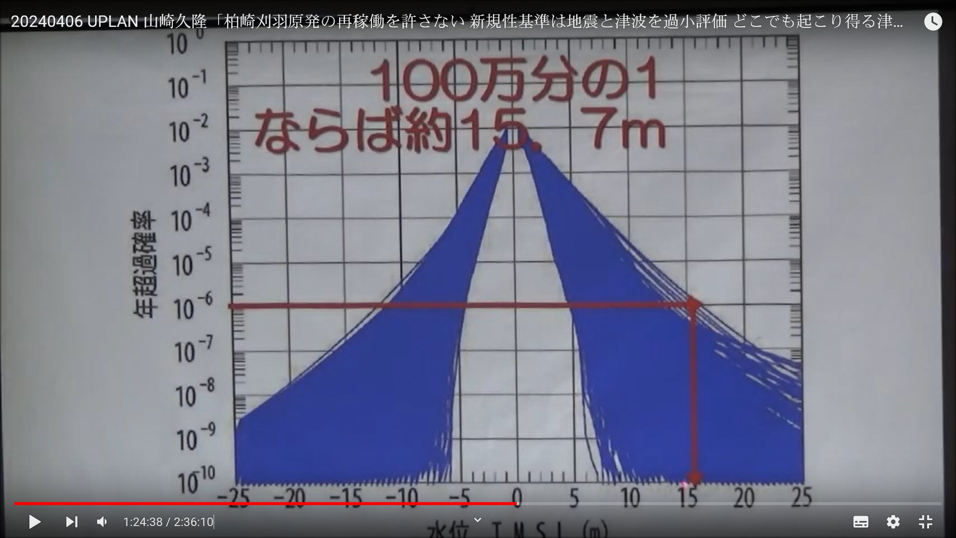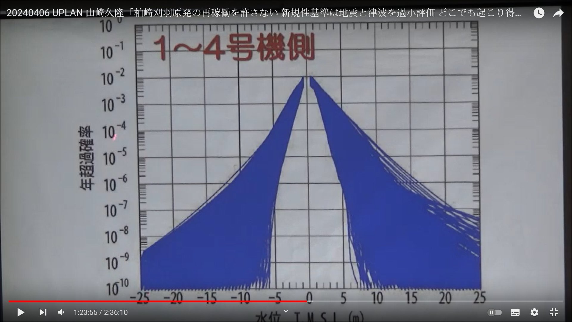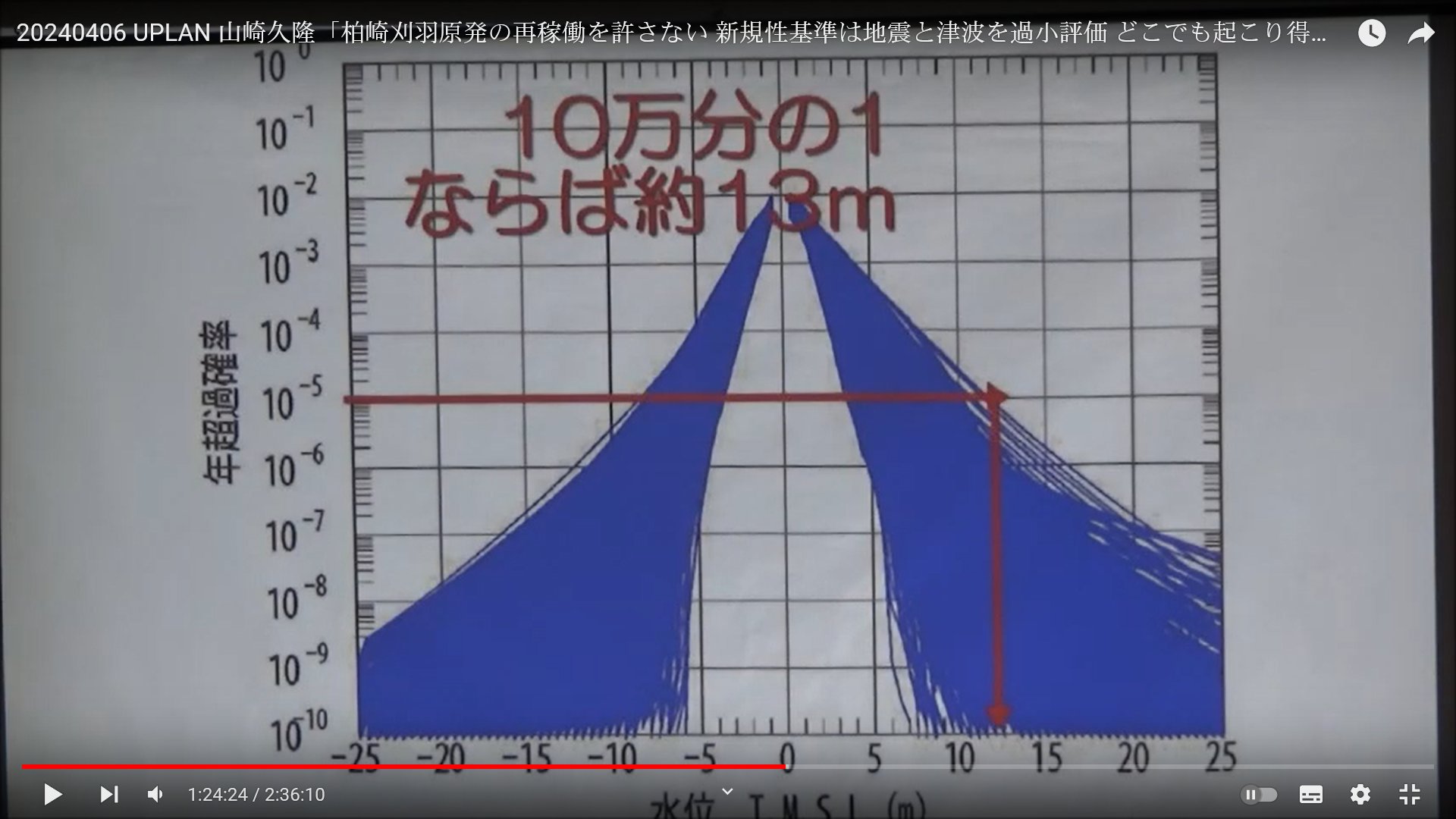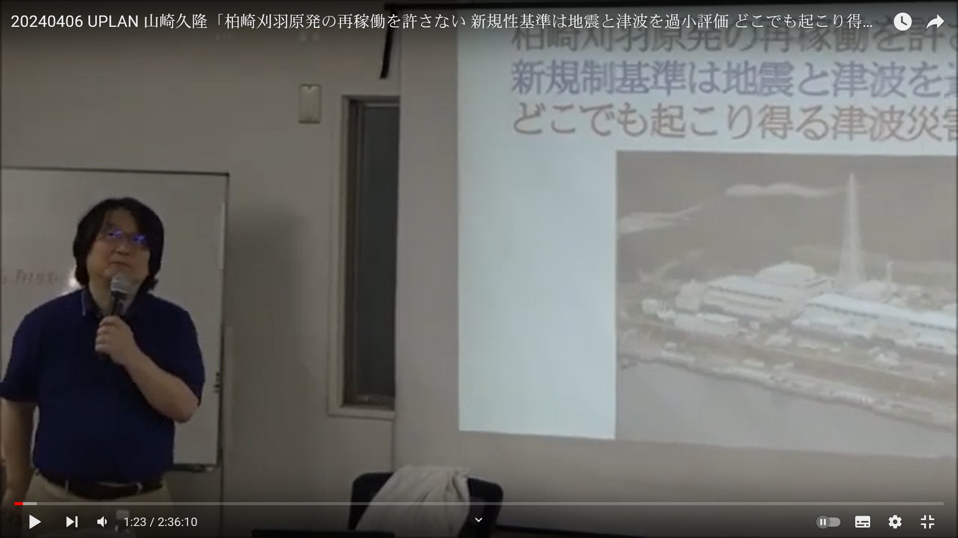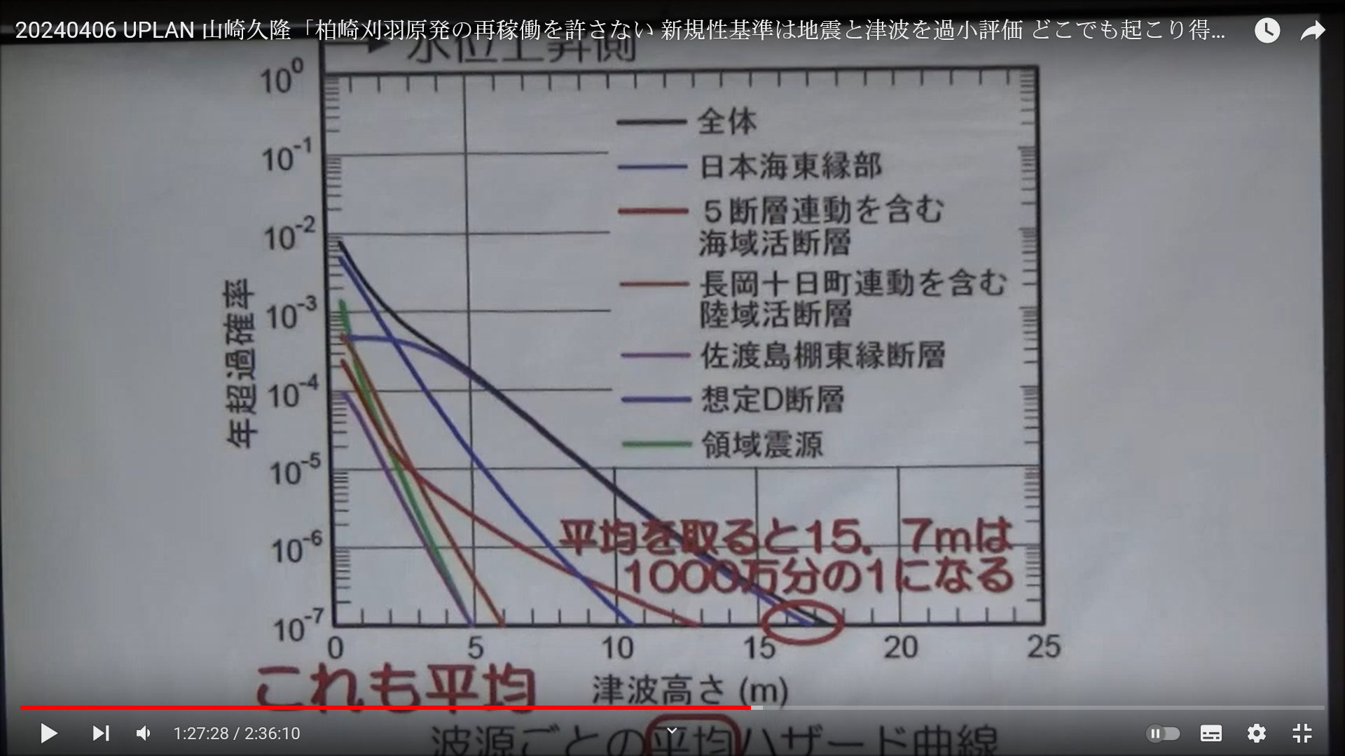 2024年4月6日にたんぽぽ舎において、山崎久隆(たんぽぽ舎共同代表)氏の講演がありました。タイトルは「柏崎刈羽原発の再稼働を許さない 新規制基準は地震と津波を過小評価 どこでも起こり得る津波災害と巨大地震」です。 以下では、 当講演のYoutube動画 に対して、静止画アイコンからビデオへの頭出し、出演者のコメントの文字起こし等の機能を付加しました。見返し等の場合に便利かと思いますので、よろしかったら、ご利用ください。